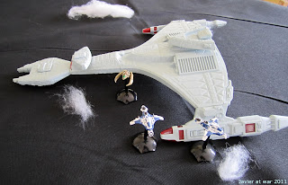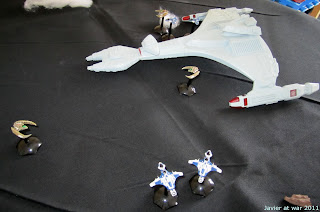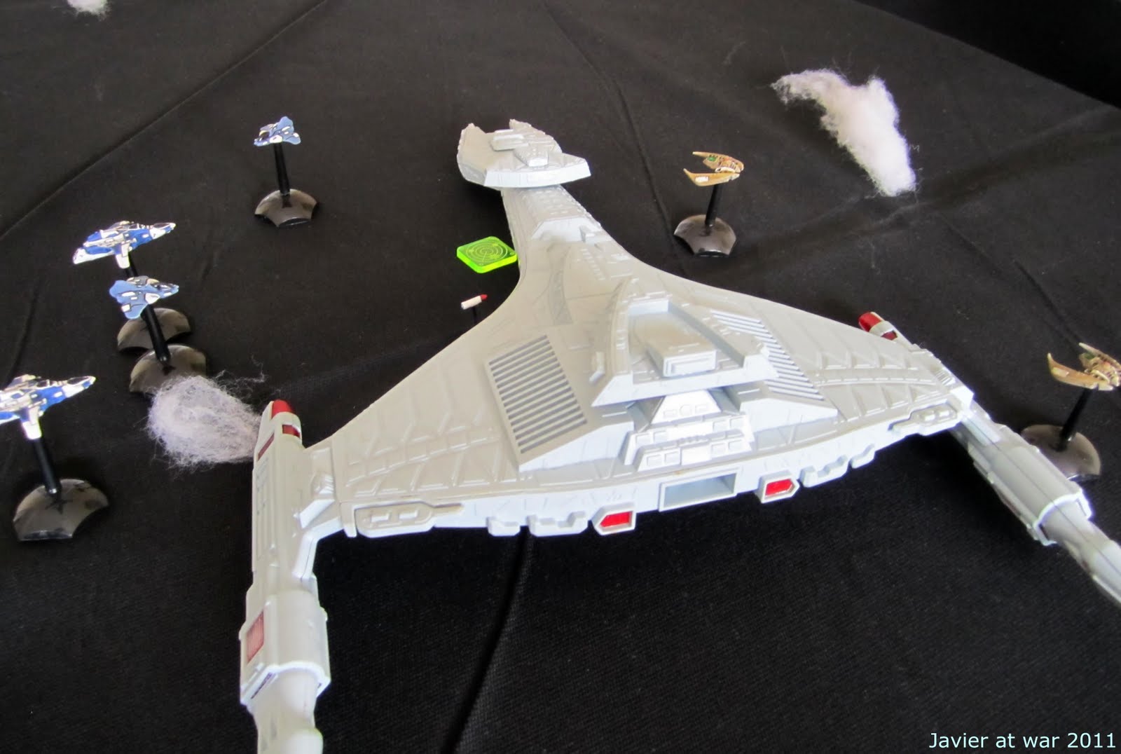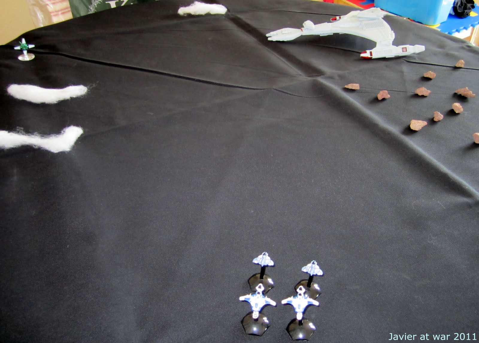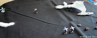 On turn two the light fighters hit Afterburners again and fire all their weapons and missiles, destroying one enemy light fighter and making the other one to use his Afterburners to avoid destruction. The bombers move normally towards the cruiser and reduce speed to star locking on torpedoes next turn.